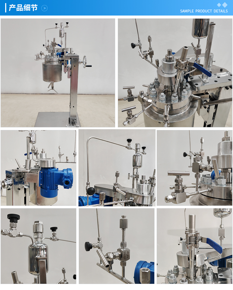 常規(guī)釜蓋開口 氣相口配針形閥,液相口配針形閥及釜內(nèi)插底管,固體加料口配絲堵,測控溫口配鉑電阻,壓力表安全爆破口配壓力表及安全防爆裝置,釜內(nèi)冷卻盤管進、出口配水咀